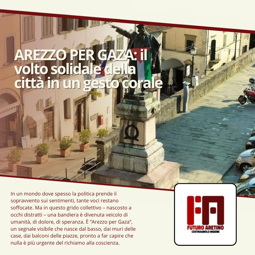 In un mondo dove spesso la politica prende il sopravvento sui sentimenti, tante voci restano soffocate. Ma in questo grido collettivo – nascosto a occhi distratti – una bandiera è divenuta veicolo di umanità, di dolore, di speranza. È “Arezzo per Gaza”, un segnale visibile che nasce dal basso, dai muri delle case, dai balconi delle piazze, pronto a far capire che nulla è più urgente del richiamo alla coscienza.