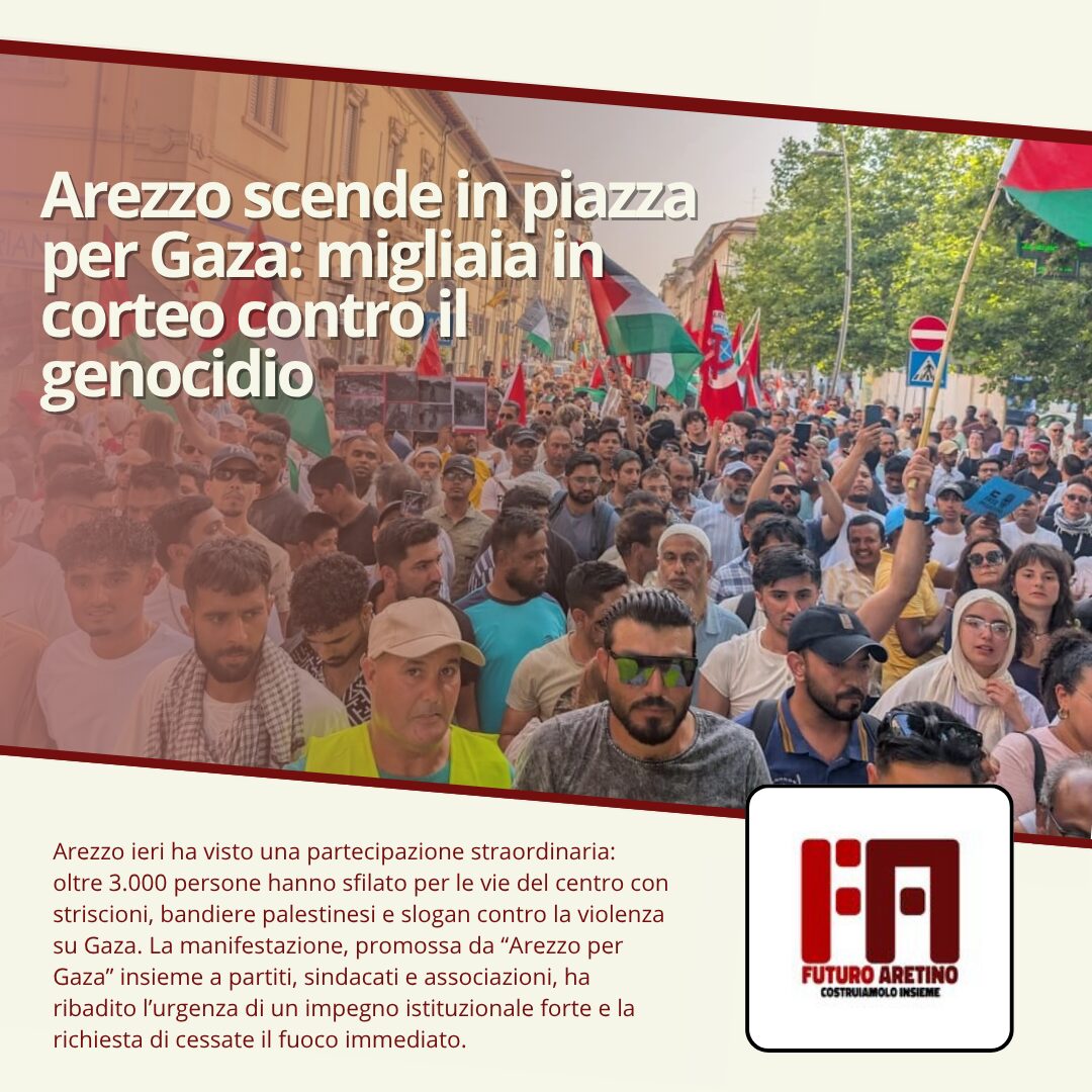 Ieri pomeriggio Arezzo è diventata per qualche ora laboratorio di impegno civile, solidarietà e protesta: una grande manifestazione per Gaza ha attraversato il centro città, richiamando cittadini di ogni età, associazioni, partiti, studenti e istituzioni locali. L’evento, promosso dalla rete “Arezzo per Gaza” con il sostegno di forze politiche, sindacali e del mondo associativo, ha voluto dare un segnale chiaro: non si può restare indifferenti di fronte a quello che molti definiscono un vero e proprio crimine contro l’umanità.