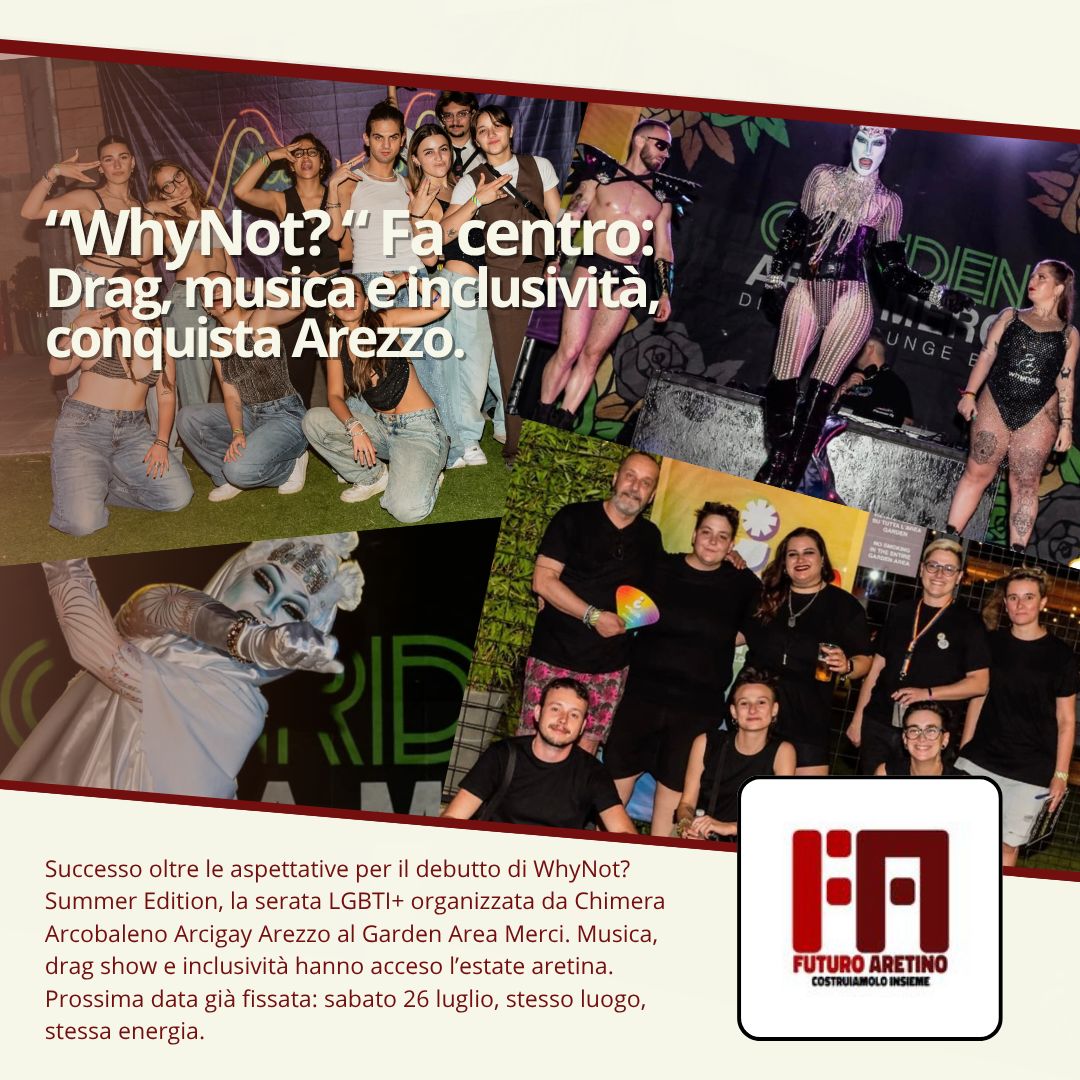 La prima serata estiva di WhyNot? Summer Edition, organizzata dall’associazione Chimera Arcobaleno Arcigay Arezzo, ha catalizzato l’attenzione di un pubblico affiatato e festante Sabato 28 giugno presso il Garden Area Merci (via Spallanzani 23). L’evento, unico nel panorama aretino per atmosfera LGBTI‑friendly e spettacoli drag, ha registrato una partecipazione straordinaria e un coinvolgimento caloroso.